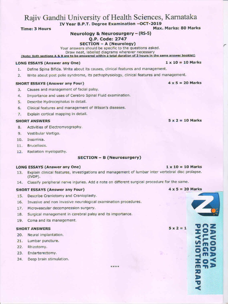 RGUHS- Rajiv Gandhi University of Health Sciences BPT First Year 1st Year 2019 April Question Papers. MPT Time table for AY 2020-21. Appointed as a question paper setter for final year BPT in The SRM University of in 20132014.
